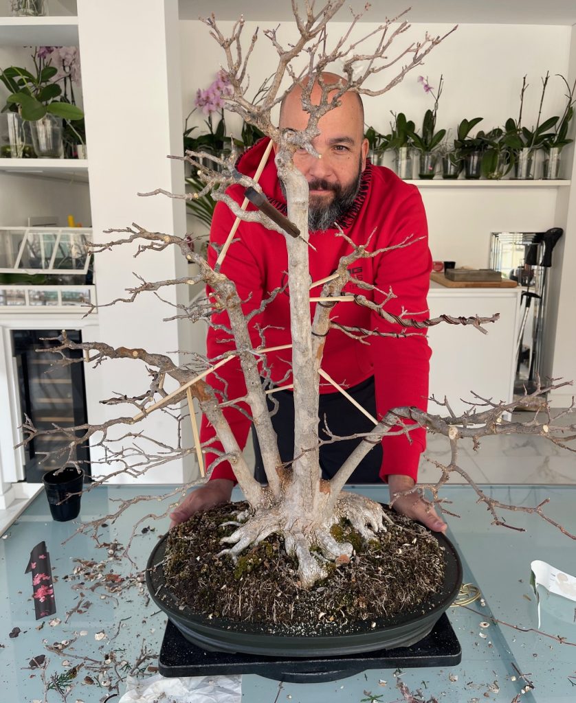 Di seguito alcune foto assieme a Roberto e il suo acero tridente che è stato oggetto d’analisi durante la conferenza e successivamente lavorato privatamente presso la sua abitazione. Trattasi di un kaede kabudachi (acero tridente in stile a ceppaia) a 5 tronchi dove abbiamo provveduto oltre che a fare una importante potatura di rientro e filatura dei soli rami necessari (preferendo come sempre l’utilizzo delle bacchette dove possibile per i vantaggi di quest’ultime), anche ad abbassare l’apice con la tecnica del cuneo.