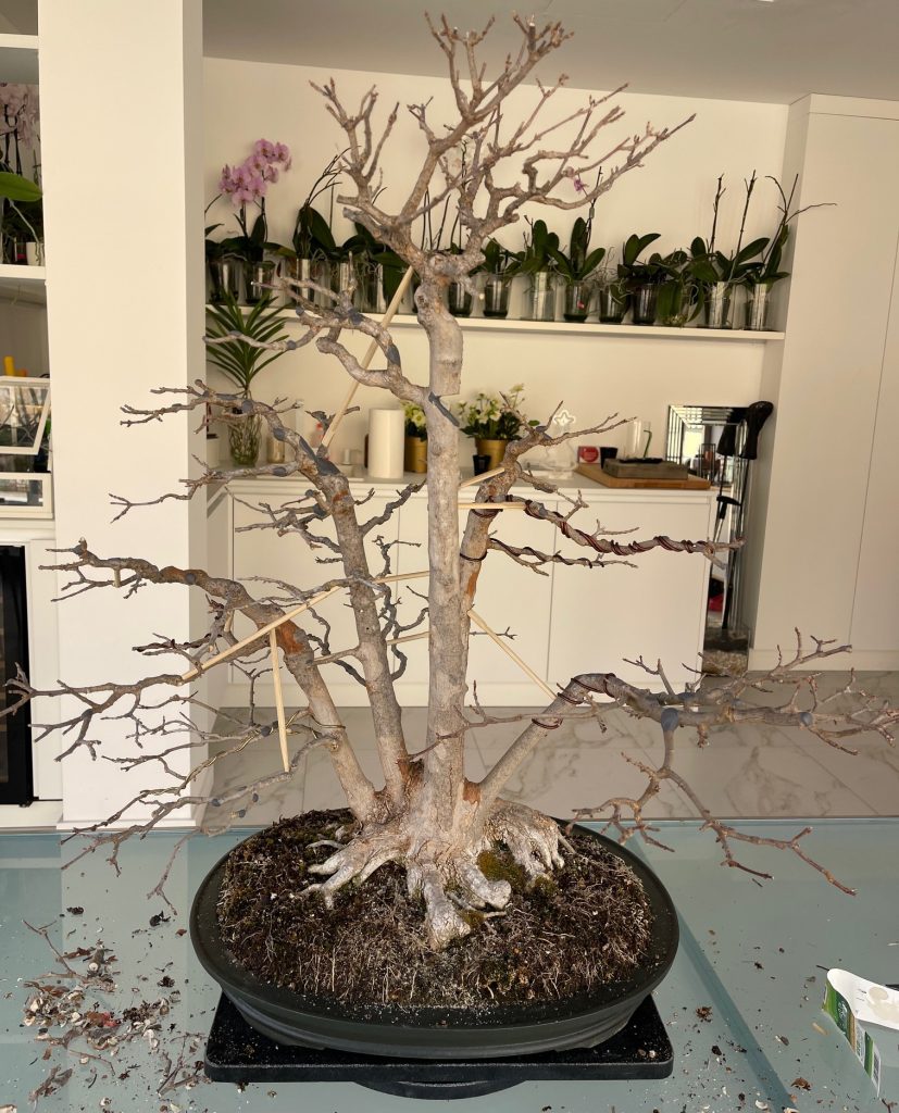 Come si può vedere i tronchi sono stati distanziati ed allargati con le bacchette, e la ramificazione risulta ordinata e ben aperta ora.
